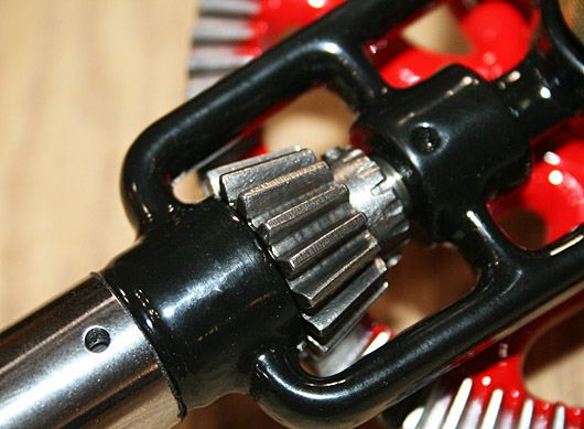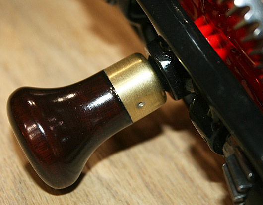 gear is painted red. Tropical hardwood main handle with