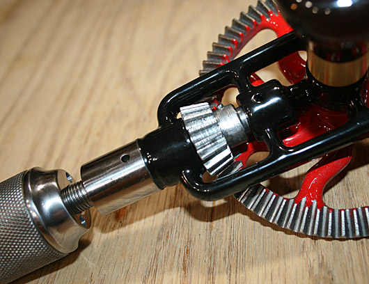 is enameled black. Drive gear is painted red. Tropical hardwood