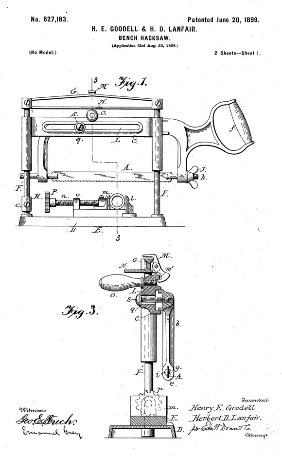 Patent 0,627,183-06/20/1899: Bench Hacksaw by Henry E.